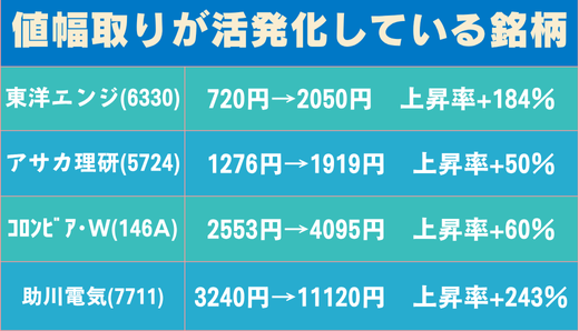 最近の物色動向では、弊社有料レポートでも取り上げた東洋エンジニアリング(6330)やアサカ理研(5724)、コロンビアW(146A)、助川電気工業(7711)などが高いパフォーマンスを示し、投資家の注目を集めています。これらの相場はいずれも明確な材料を持ち、短期勢が流れを主導して相場を動かす構図が見られます。また、投機性の高い資金の動きが活発化しており、投機筋やファンド系トレーダーの戦術的な取引が交錯することで相場全体にスピード感と緊張感が漂っています。資金の方向性がより鮮明となり、チャート上にも勢いが刻まれています。