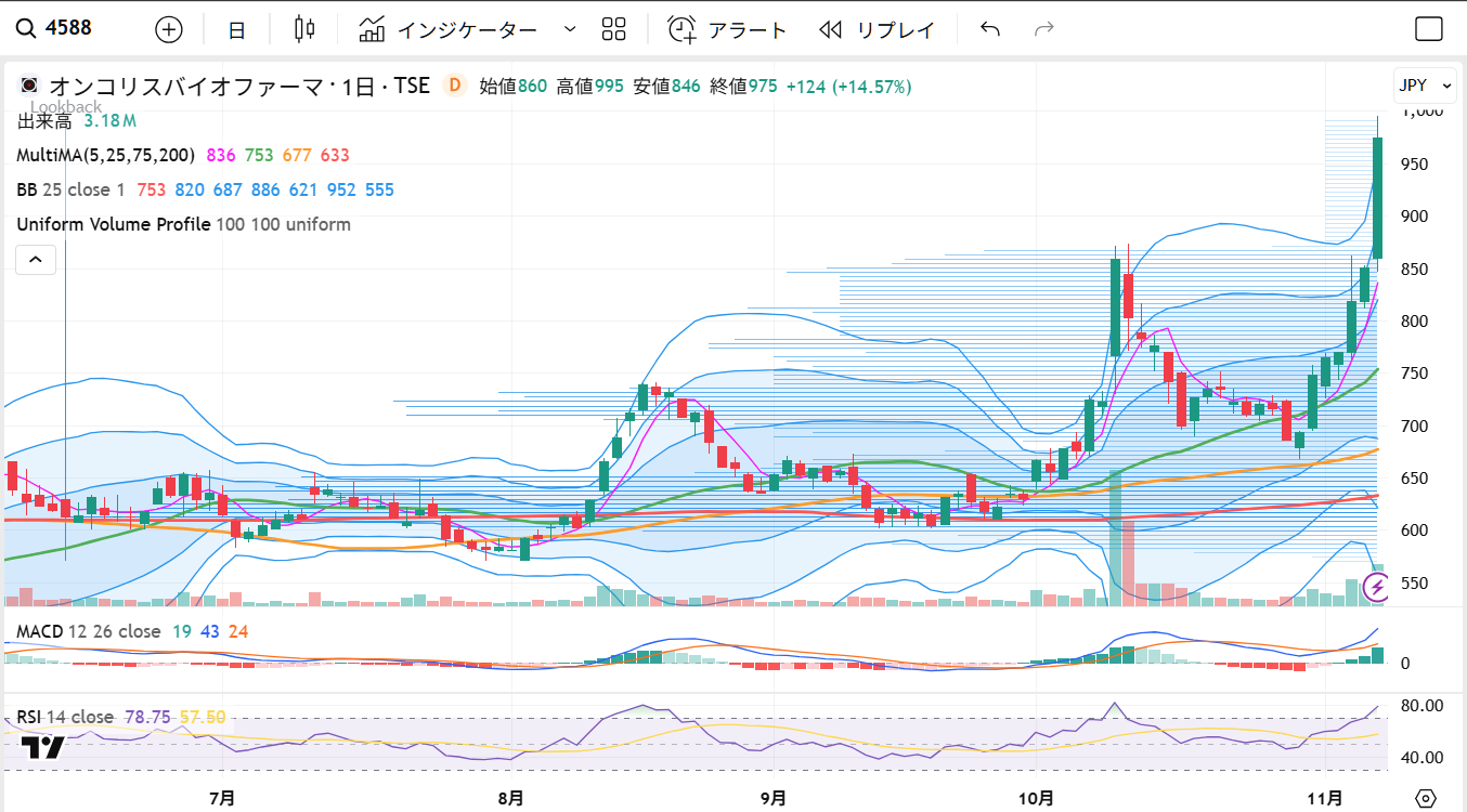 11月6日に発表されたオーファン指定審議の前倒しと、翌7日の第3四半期決算を無難に通過したことが、市場に安心感をもたらしました。決算内容は売上高約2,800万円、営業損失15億円超と依然として厳しいものでしたが、重いイベントを終えたことで「悪材料出尽くし」と受け止められ、買い戻しが進行。株価は700円台から995円まで急伸し、短期資金の流入によって出来高も急増しました。典型的なイベント通過後の思惑相場といえます。