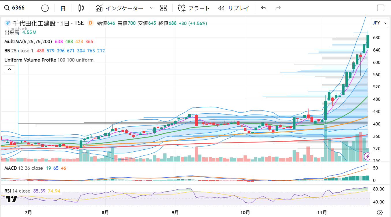 千代田化工建設(6366)は10月下旬から続く上昇基調を強め、直近では700円台を中心とした高いボラティリティを伴う相場へ発展しています。今回は、この上昇相場を支える材料と需給の変化、さらに投機系ファンドの動きを踏まえながら、トレンドの行方と今後の展開とポイントを整理します。
