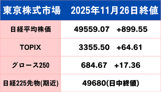 きょうの東京株式市場は、米国の弱い経済指標をきっかけとした利下げ期待が再燃し、全面高の展開となりました。日経平均は900円近い上昇となり、値がさ株を中心に買いが優勢でした。米国市場が金利低下を先取りする形で上昇した流れを引き継ぎ、日本株にも短期資金が流入しやすい地合いでした。この上昇は業績再評価より金利観測の影響が強く、指数主導の色彩が濃い点には注意が必要です。