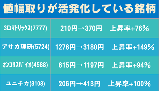 物色面では、弊社の有料レポートで取り上げた3Dマトリックス(7777)やアサカ理研(5724)、オンコリスバイオ(4588)、ユニチカ(3103)などが、直近で鋭い値幅を伴う上昇を示しています。これらの動きは、単なる材料の有無では説明しきれず、浮動株の軽さや仕掛けが入りやすい需給構造が背景にあります。特にバイオ関連は材料の“鮮度”が市場心理を強く刺激し、出来高を伴った上放れが確認される局面では、短期勢の参入が一段と加速しやすい特徴があります。