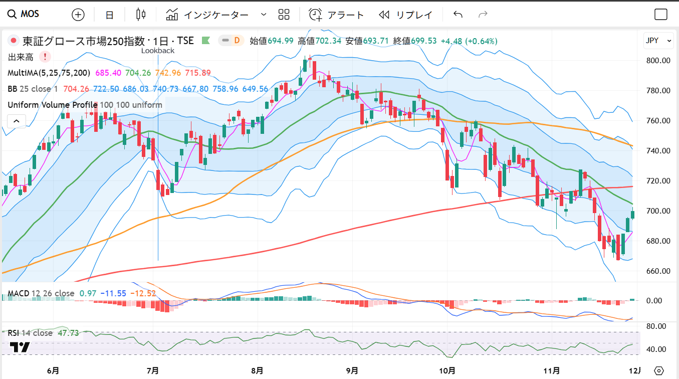 テクニカル面では、グロース250指数は依然25日移動平均線に上値を抑えられており、明確なトレンド転換には至っていません。出来高は底打ち感を示すほど強くないものの、急速な下押しが止まりつつある点は、投資家が売り急がなくなった兆しと捉えることができます。MACDも低位圏での下げ止まりが見られ、勢いの弱さは残るものの、短期的には反発余地を示唆する形です。こうした状況下ではテーマ性よりも値動きの軽さが優先され、時価総額の小さい銘柄ほど反応が早い傾向が続いています。