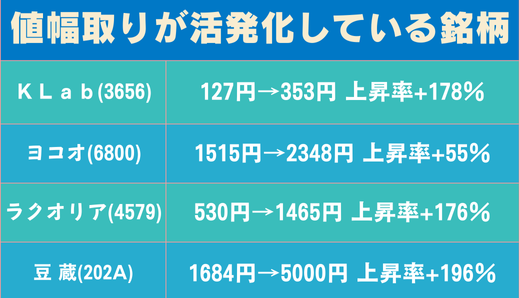 KLabやラクオリア創薬のように市場心理を刺激しやすい材料株は、短期筋の反応が速く、初動で一気に値幅が出る傾向があります。一方、ヨコオや豆蔵のようにテーマ性と成長性を併せ持つ銘柄は、指数が重い局面でも独自の上昇トレンドを描きやすく、需給改善とともに選別買いが入りやすい地合いとなっています。