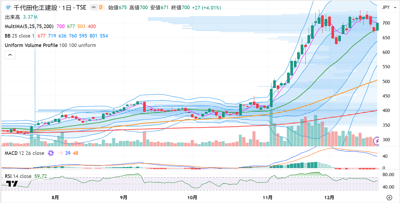 千代田化工建設(6366)は、11月後半にかけて急伸した後も大きく値を崩すことなく、年初来高値圏を意識した水準での推移が続いています。前回の記事(2025年11月21日)で示した「再評価相場の初動」という見方は、足元の値動きを踏まえても大きく修正する必要はありません。ただし、直近の相場は上値を積極的に追う局面ではなく、高値圏での持ち合いが中心となっており、相場の性質は一段落した段階に入っています。
