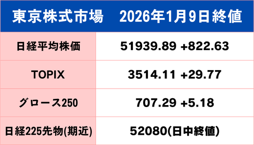 新年相場入りとなった今週は、日経平均が史上最高値に接近する水準まで上昇する一方、グロース市場でも個人投資家を中心とした物色が活発化し、全体としてリスク選好の地合いが意識される一週間となりました。