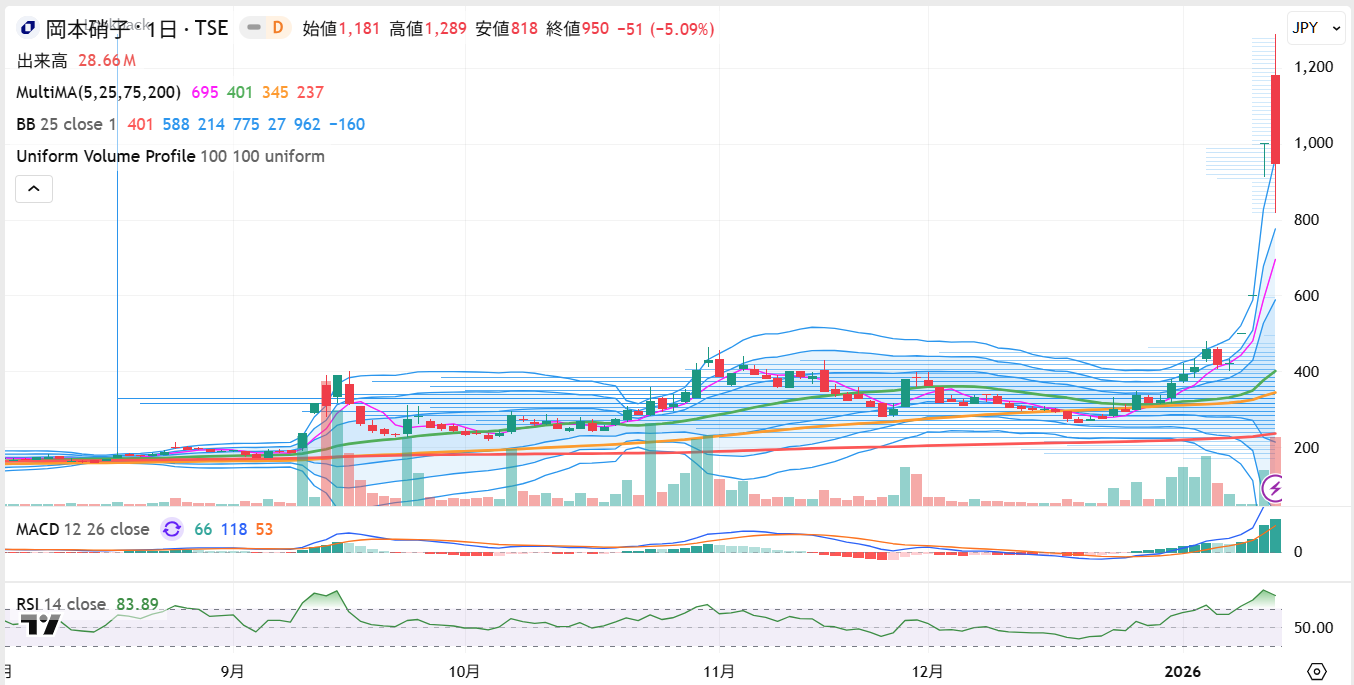 前回の記事(2025年10月29日投稿)以降、岡本硝子(7746)の株価は大きく水準を切り上げました。株価は当時の346円から、2026年1月中旬には年初来高値を更新し、一時は約270%の上昇となっています。前回の記事で示した「テーマ性と需給の改善が重なり、値幅が出やすい局面にある」という見立ては、結果として現在の相場にも概ね当てはまっているといえるでしょう。