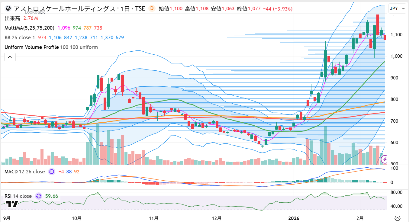 アストロスケール(186A)は、2025年12月に600円台前半で底固めの動きを見せた後、2026年1月に1,000円台まで急伸しました。防衛分野での研究契約の獲得やJAXA宇宙戦略基金の採択、NASA関連案件の発表など、日米欧にまたがる国家関連の案件発表が続いたことは確認できます。ただし足元は営業赤字が継続しており、利益面での改善は途上段階です。