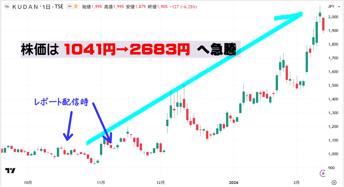 指数の方向感とは別に、個別の需給で動く銘柄が物色される局面です。昨年10月から11月にかけて弊社有料レポートで複数回取り上げ、その後大きな値幅を形成したKudan(4425)。当時は市場の注目が限定的でしたが、結果として高いパフォーマンスを示しました。値動きの初期段階で着目する重要性を、あらためて示した事例といえます。