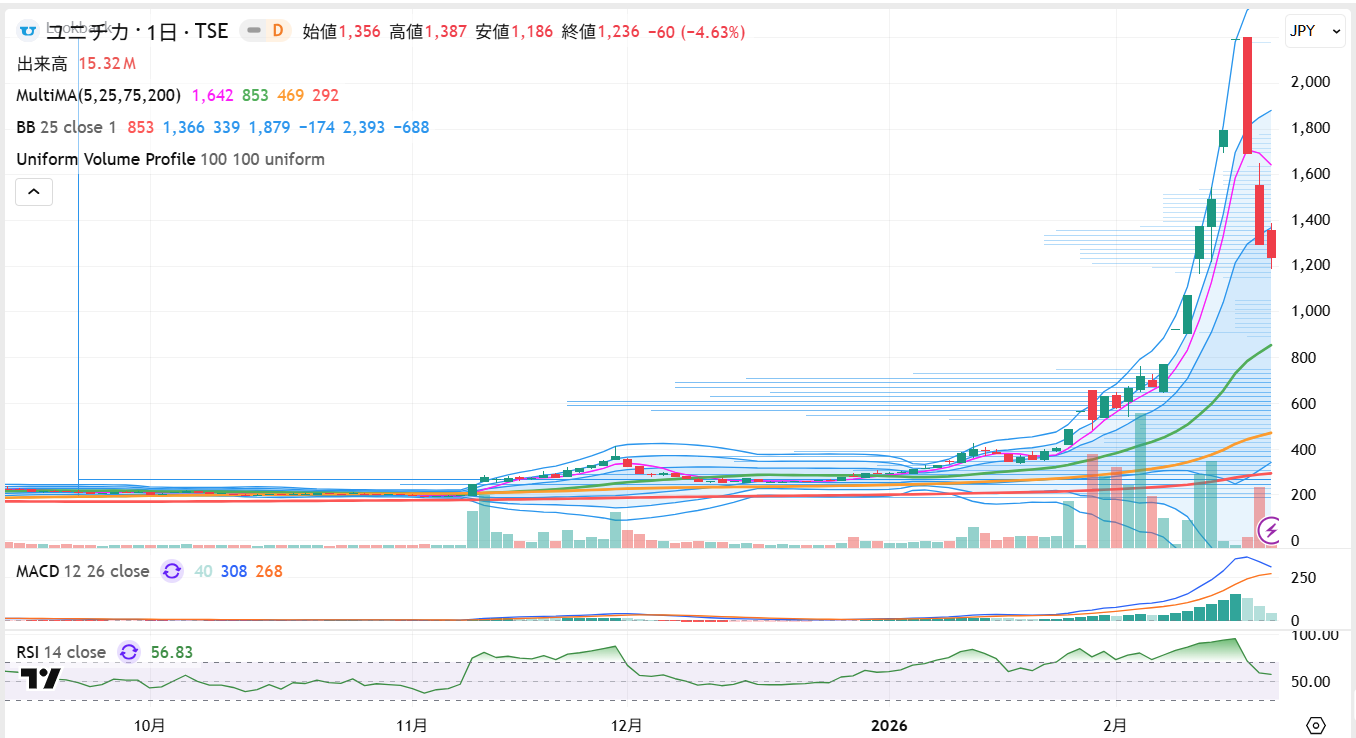 昨年11月24日の前回記事から約3ヶ月、ユニチカ(3103)の株価は文字通り別次元の推移を辿りました。当時の304円から、2026年2月18日には一時2,200円まで急騰。弊社では昨年9月下旬、206円の水準から弊社有料レポートにおいて、外資系投機筋の関与および構造改革の進展に着目し、一貫してその潜在力を指摘してきました。前回掲げた「310円突破による強気シナリオ」は、単なる水準訂正を遥かに超える記録的な大相場へと発展しています。