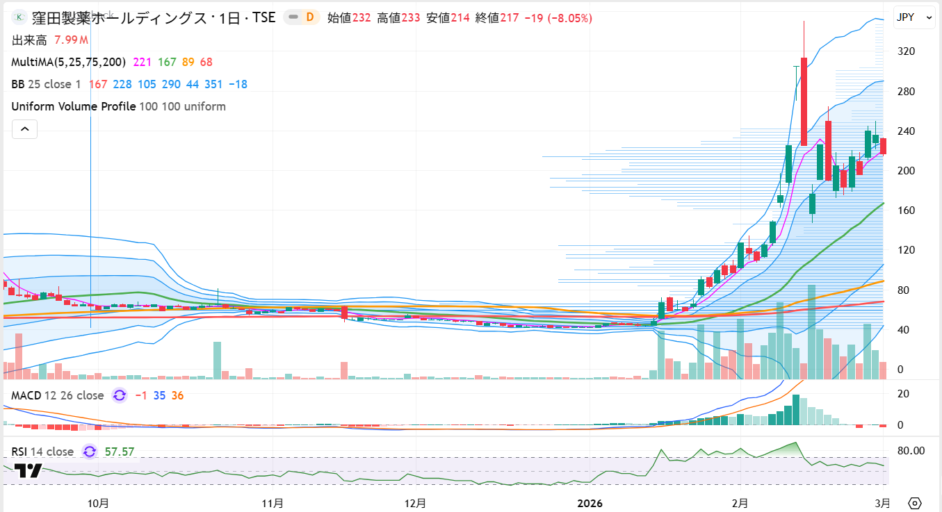日足チャートと時系列データに基づきテクニカル面を分析すると、需給の歪みは明らかです。直近の急騰局面では、200円から250円の価格帯で数千万株規模の膨大な出来高を形成しました。価格帯別出来高の分布を見ると、この水準には強烈な「しこり」が蓄積されており、将来的に極めて強固な上値の壁として機能することが想定されます。高値圏で巨大な出来高を伴う長い上髭が出現したことは、短期的な天井を打ち、需給が売り優勢へと転換した可能性を示唆する強いシグナルです。
