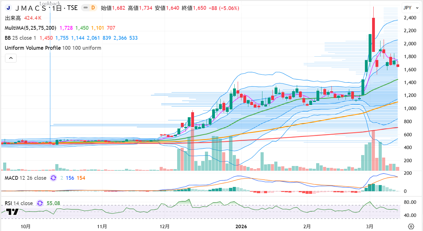 また、JMACSは発行株式数が約580万株と少なく、時価総額も100億円規模にとどまる超小型株です。この規模の銘柄は浮動株が限られるため、短期資金が集中すると値動きが一気に軽くなる傾向があります。実際、2月下旬以降の株価は急速に上昇し、短期間で大きな値幅を形成しました。業績改善という明確な材料がある一方、こうした需給の軽さが短期資金を呼び込み、株価上昇を加速させたと見るのが自然でしょう。