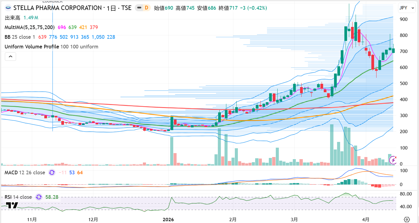 次に見るべきは25日線です。ここを下値支持線として上昇基調を保てるかどうかが注目されます。4月13日時点の株価は、5日移動平均上に戻しており、急騰後の調整を経て、日足の崩れもやや落ち着いてきました。700円前後を保ちながら25日移動平均の押しをこなすなら、相場はなお続く余地があります。逆に25日線を明確に割り込み、出来高を伴って600円近辺を崩すなら、短期資金の撤収を警戒すべきでしょう。上値ではまず750円台の回復、その先は3月末以降に商いが膨らんだ800円前後をどうこなすかが焦点になります。