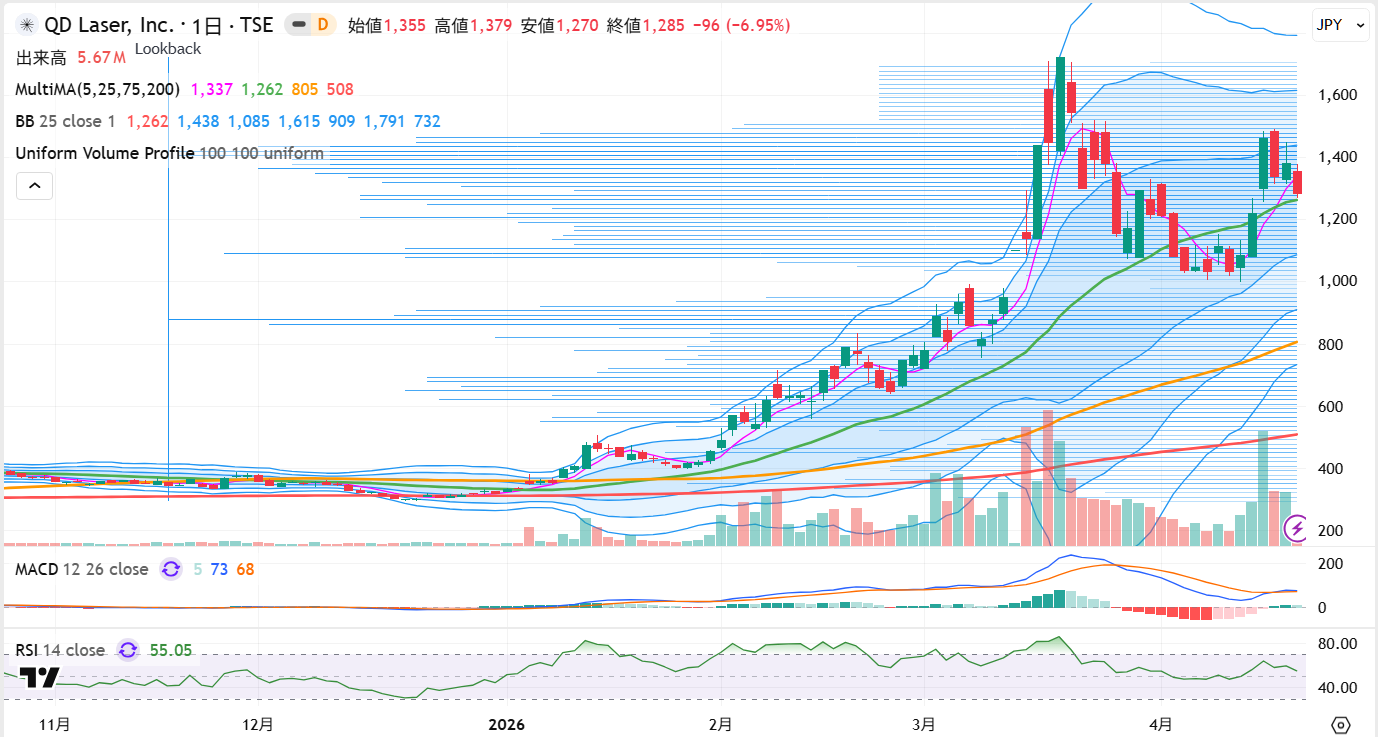 テクニカル面では、4月17日終値1,285円は5日線(1,337円)をわずかに下回りますが、25日線(1,262円)は上回っており、75日線(805円)・200日線(508円)からの大幅乖離も続いていることから、上昇トレンドは維持されています。RSIは55.05と中立圏、MACDはシグナルを上回り陽転しており、上昇モメンタムの回復を示しています。ボリンジャーバンドは3月の急拡大から縮小傾向にあるものの、バンド幅はなお広く、値幅の大きい展開が続いています。当面の焦点は4月14日高値1,485円の上抜けで、これを突破すれば年初来高値1,707円への再挑戦シナリオが強まります。逆に25日線を下割れするようであれば、下値模索への転換に警戒が必要です。
