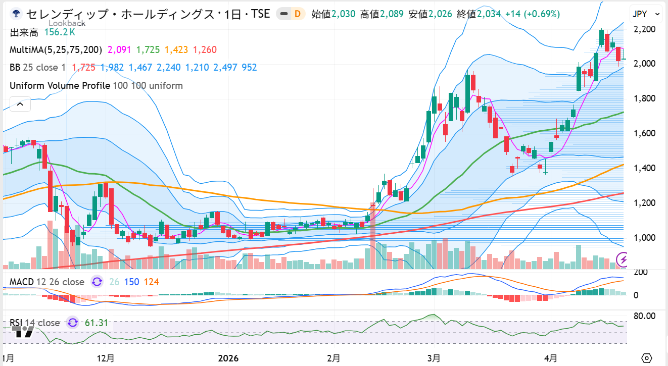 セレンディップ・ホールディングスは、4月20日時点でも強い相場基調を維持しています。終値は2,034円、前営業日比14円高にとどまりましたが、4月14日に2,207円まで買われた後も、2,000円台を維持しています。2,000円台を維持している点は重要です。日足ではボリンジャーバンドの+1σ上を保っており、この水準を維持する限り、上値を意識した展開が続きやすい形です。上昇トレンドが崩れていない以上、現時点で積極的に売る理由は見当たりません。
