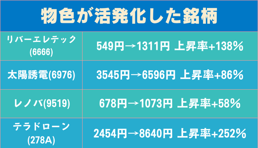 具体的な個別材料株物色の動きでは、弊社の有料レポートでも取り上げてきた、リバーエレテック(6666)や太陽誘電(6976)、レノバ(9519)、テラドローン(278A)などは、直近にかけて強い値動きを示しています。これらが値幅を出した背景には、業績や事業テーマへの期待だけでなく、投機性の高い資金の関与があったことは間違いありません。安値圏で株を買い集め、節目を上抜けた局面で追随買いを呼び込み、一気に値幅を取りに来る。短期資金が好むこの手口は、相場の局面を問わず繰り返されてきたものです。